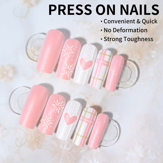 24pcs Christmas Press-On Nails Set - Medium Length, 3D Heart & Snowflake Designs with Glossy Finish, Full Coverage Acrylic Fake Nails for Women and Girls - Includes Jelly Adhesive, Nail File & Wooden Stick