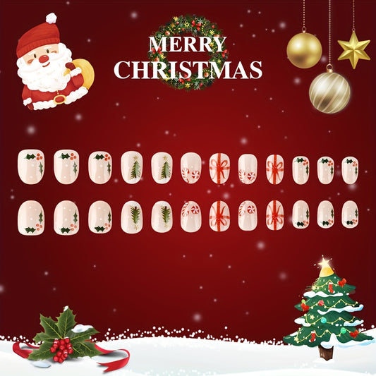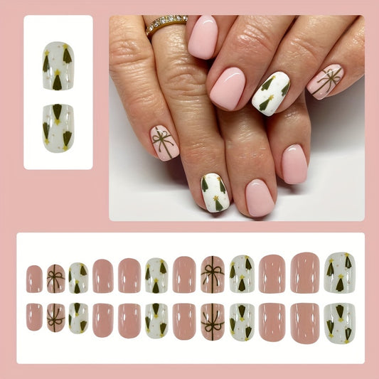 24-Piece Press-On Nail Set - Short Green & Pink Nails with Glossy Finish, Christmas Tree & Gift Star Patterns, Includes Jelly Glue & Nail File
