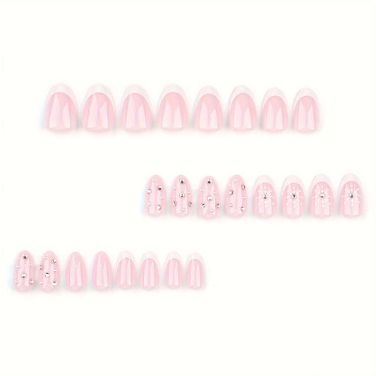 Pink Almond Short Nails, Christmas Snowflake Press-On Nail Set, French Manicure Fake Nails with Rhinestone Accents, Metallic Finish, Beauty & Personal Care, Nail Art Accessories