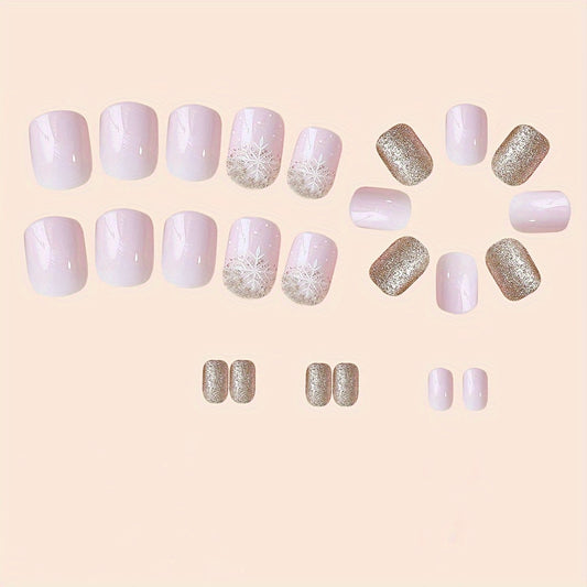 24pcs Short Square Press-On Nails Set - Glittery Golden Glossy Finish with White Snowflake Gradient Design, Removable False Nails for Women and Girls, Includes Jelly Adhesive Tabs and Nail File