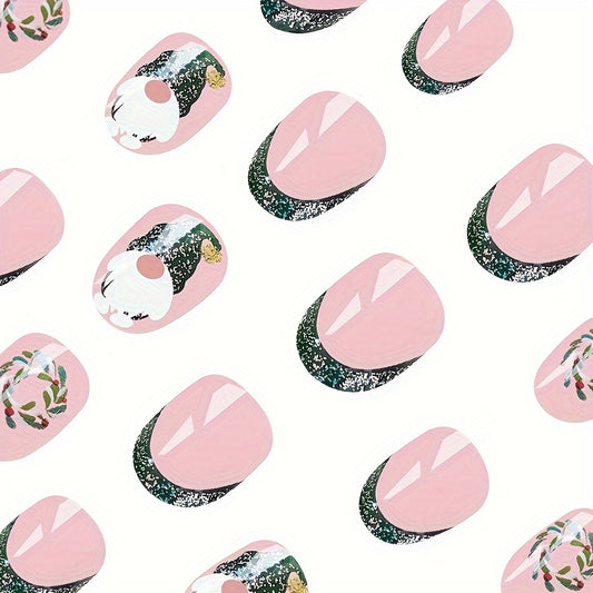 24-Piece Short Oval Press-On Nails Set - Glossy French Tip with Glitter, Santa & Christmas Wreath Design, Holiday-Themed Full Cover Artificial Nail Kit for Women and Girls with Jelly Glue & File