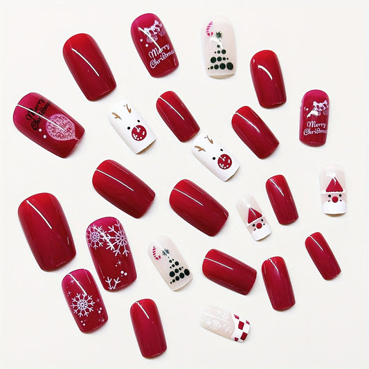 24-Piece Christmas Nail Art Set - Short Square Press-On Nails with Glossy Finish, Festive Reindeer, Snowflake, and Tree Designs, Red and White Tones, Easy to Apply with Nail File and Jelly Glue Included