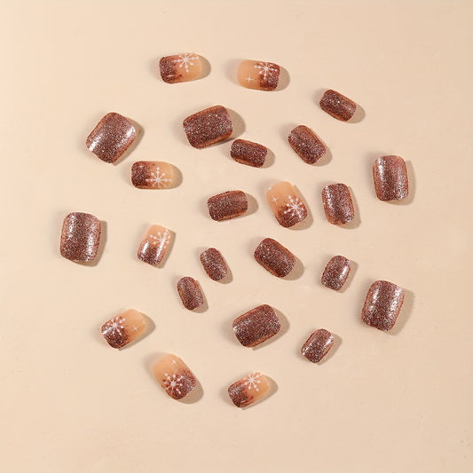 24Pcs Christmas Mixed Color Glitter Snowflake Press-On Nails, Short Square Shape, Glossy Full Cover Fake Nails Set for Women and Girls