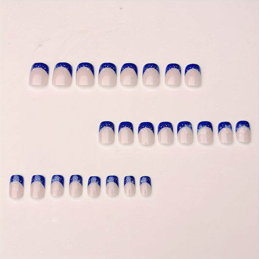 24pcs Christmas Short Square Press-On Nails, Blue French Style, Elegant White Snowflake Design, Fashion Removable Nail Tips, Glossy Finish, Nail Art for Hands and Feet