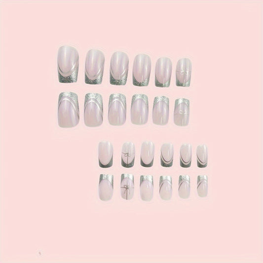 24pcs Christmas Press-On Nails Set - Short Square, Glossy Finish with Silvery Glitter & Festive Bow Designs, Includes Jelly Adhesive & Nail File